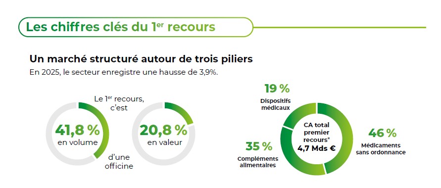 Ces produits de premier recours correspondent à trois grands statuts de produits : les médicaments accessibles sans ordonnance (46 % des ventes), les compléments alimentaires (35 %) et les dispositifs médicaux grand public (19 %). Derrière « cette répartition stable et qui reflète une offre diversifiée et ancrée dans les habitudes des Français, ces équilibres masquent néanmoins des dynamiques contrastées selon les segments. » (communiqué de presse NèreS, 30 janvier 2026).