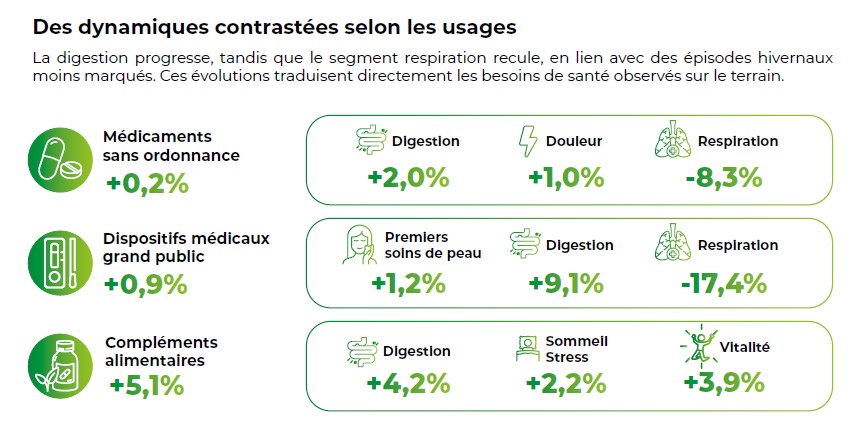 These first-line products fall into three main categories: over-the-counter medicines (46% of sales), dietary supplements (35%), and consumer medical devices (19%). Behind « this stable distribution, which reflects a diversified offering rooted in French habits, these balances nevertheless mask contrasting dynamics across segments. » (NèreS press release, January 30, 2026).