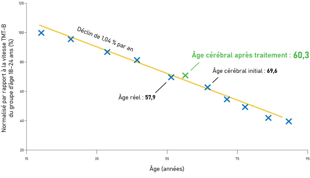 Fig. 1: With age, cognitive processing speed (TMT-B) declines linearly. After 12 weeks of Magtein supplementation, subjects showed a measurable improvement in their brain age profile, approaching nine years closer to normal compared to their initial profile13.