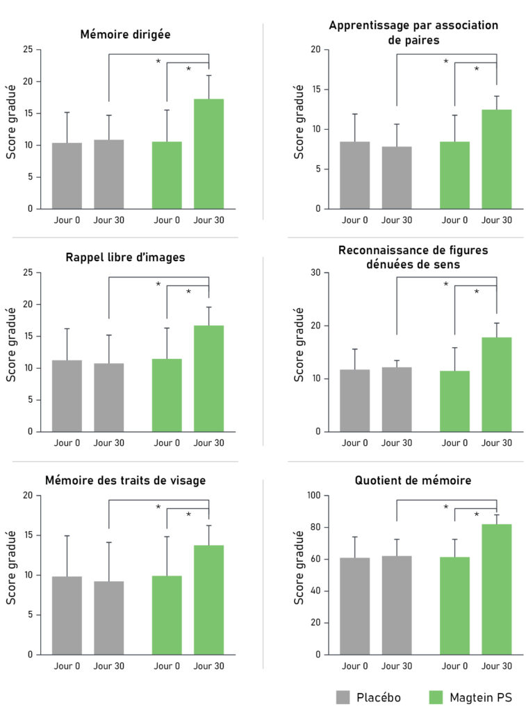 Dans l’essai clinique le plus récent, la supplémentation en Magtein a significativement amélioré les performances cognitives, avec des bénéfices mesurables dans de multiples domaines, notamment la mémoire de travail et la mémoire épisodique.[16] Ces améliorations ont été observées dans le cadre d’un essai randomisé, en double aveugle et contrôlé par placebo, confirmant ainsi le rôle de Magtein dans la promotion de la mémoire et le vieillissement cognitif sain.