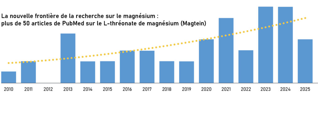 Du fait que ces deux composants sont naturellement présents dans l’organisme, le L-thréonate de magnésium – désormais breveté et commercialisé sous le nom de Magtein® – est biologiquement compatible et s’intègre parfaitement aux voies métaboliques normales. Il demeure l’ingrédient de magnésium le plus efficace en matière de biodisponibilité cérébrale et son efficacité repose sur sa capacité à traverser la barrière hémato-encéphalique et à pénétrer dans les neurones. L’unicité de Magtein est soutenue par portefeuille de brevets. Son efficacité est étayée par un programme de recherche clinique rigoureux, avec cinq études cliniques en double aveugle contrôlées par placebo déjà publiées, ainsi que des recherches supplémentaires en cours.